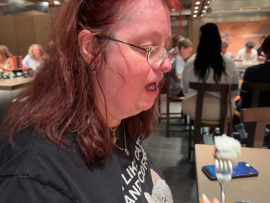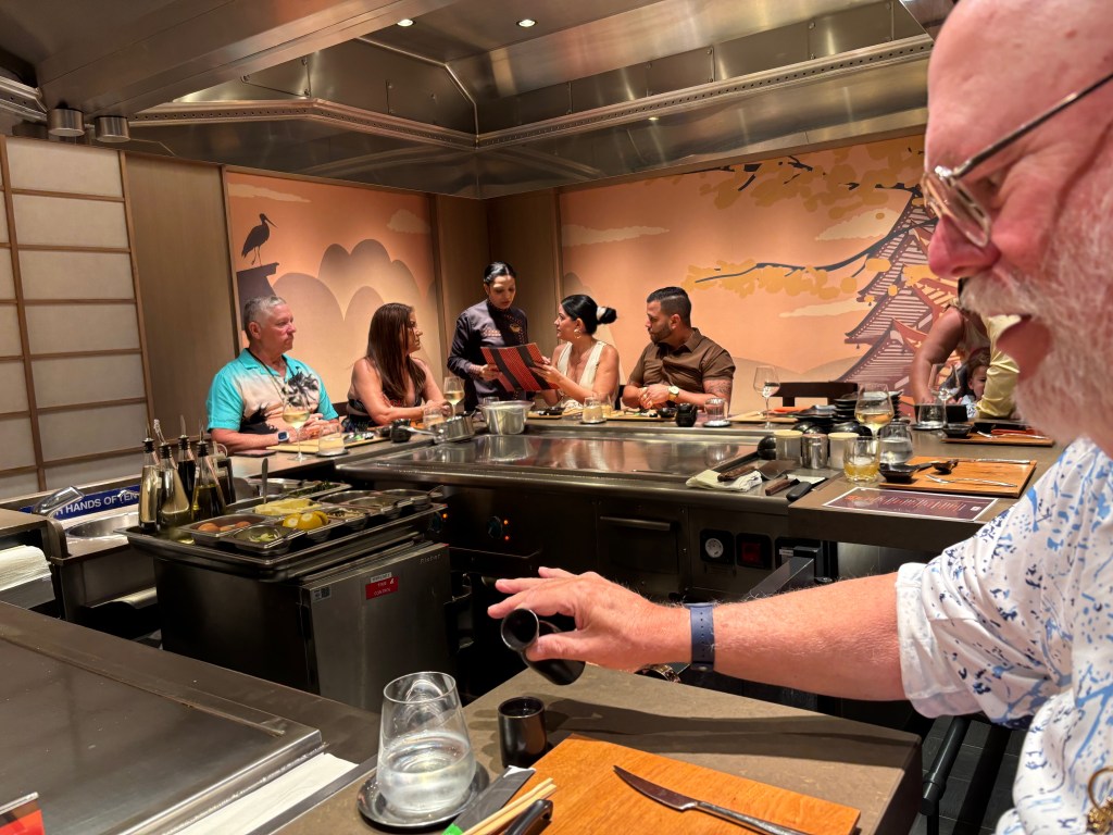 When we got back to the ship, we took some time to cool off in our air-conditioned cabin before trying to find someplace to get a smoke outside where we weren’t being baked by the sun. At 5:30 it was time to make our way to the Kaito Teppanyaki restaurant for dinner and a show.